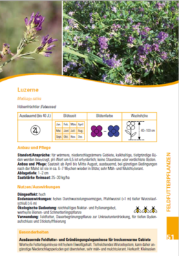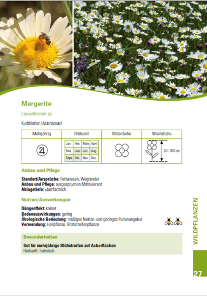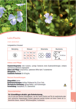 Eine Broschüre des FiBL stellt die 55 wichtigsten Blühstreifenpflanzen in ausführlichen Pflanzensteckbriefen vor. Die Broschüre widmet sich Fragen wie: Welche Pflanzen sollen in den Blühflächen vorkommen und welche Eigenschaften haben sie? Sind sie nur Insektennahrung oder können sie auch den Boden verbessern und düngen? Wie soll man sie anbauen und wie reagieren sie auf Pflegemaßnahmen?